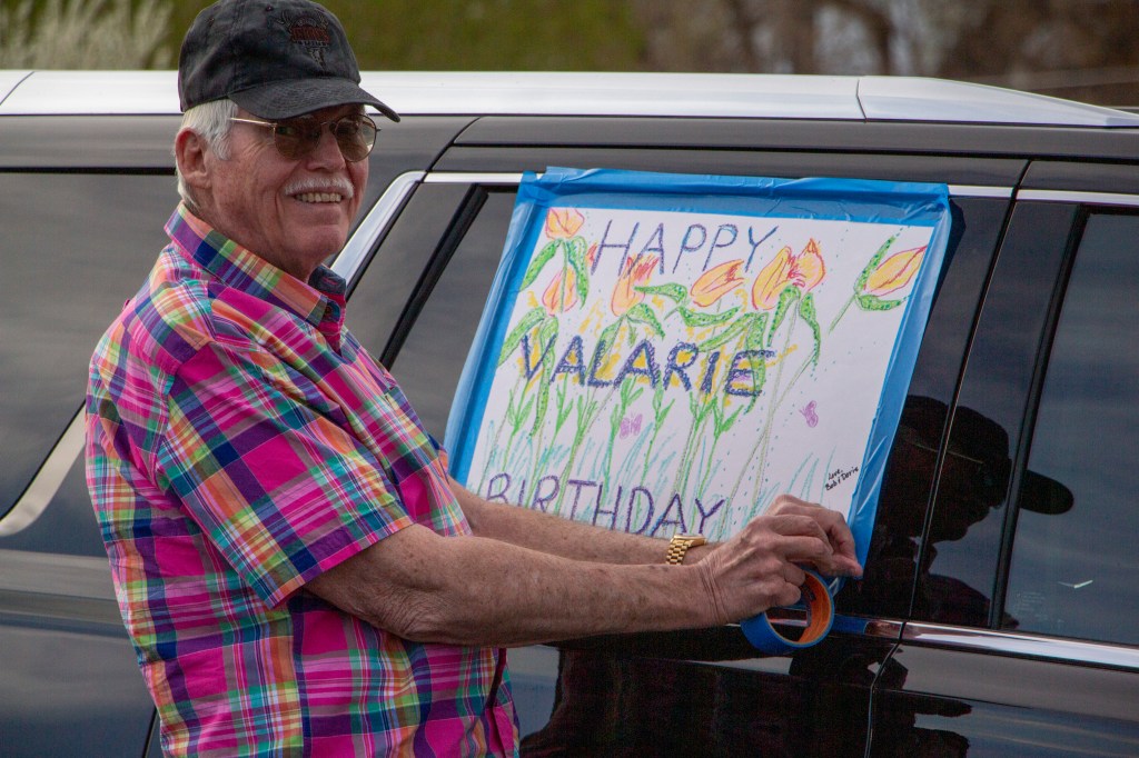 Cars start to trickle into the meeting place, an empty lot around the corner from Miller’s house. Each car has some sort of decoration; a “Happy Birthday Valarie!” banner here, some balloons there. Miller’s daughter, Lori Fay, hops from car to car, greeting loved ones from a safe distance. She informs everyone of the plan.