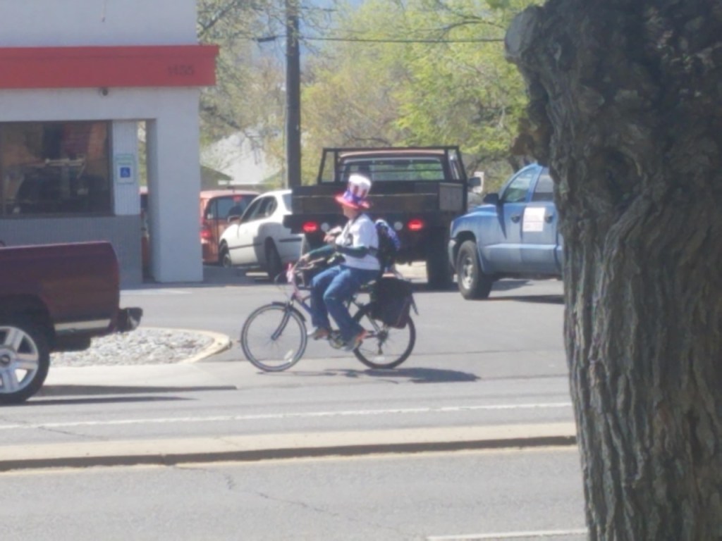 11:48: Riding up North Ave. from Fifth Street is a woman on a bike wearing an “Uncle Sam” top hat.