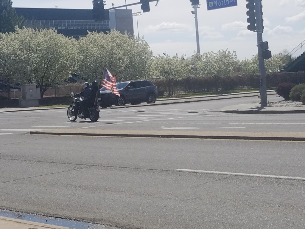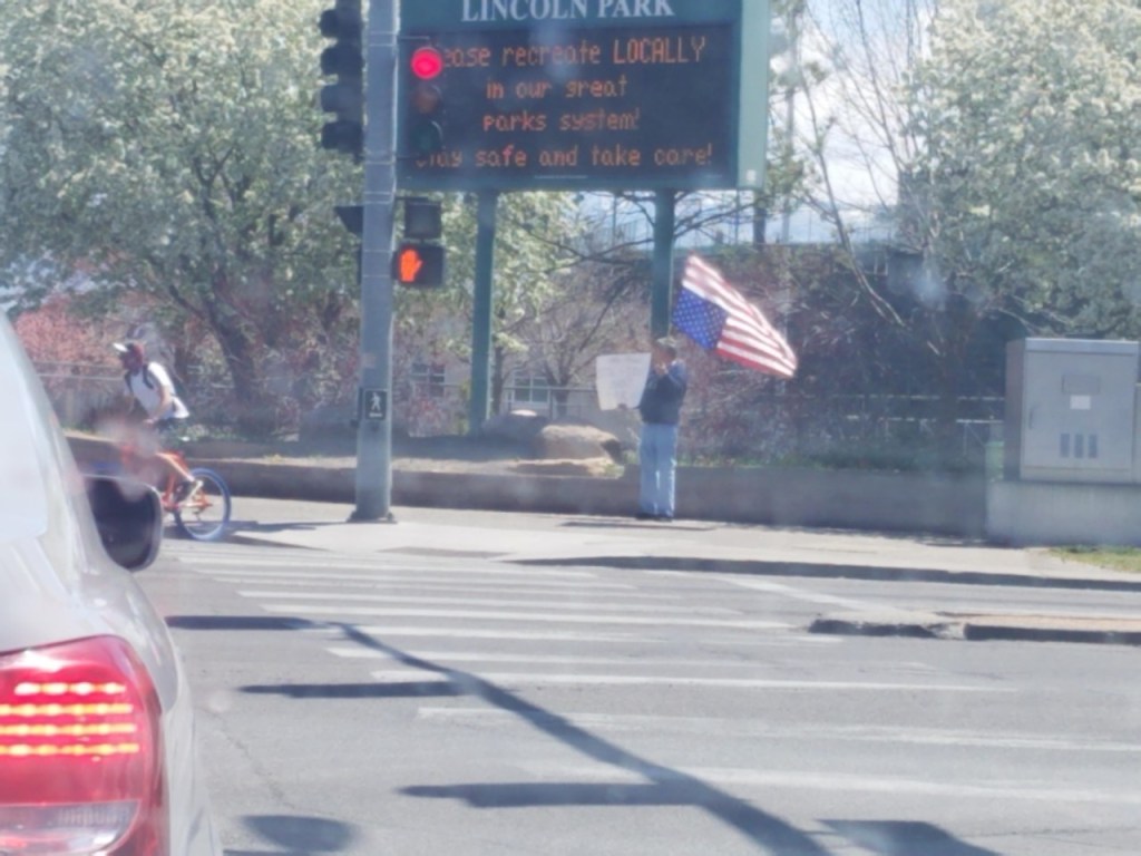 12:17: Turning onto North, the traffic has increased to almost a regular lunch rush on North Ave. On the way, I see somebody has taken the woman’s place holding a sign and waving an American flag upside down.