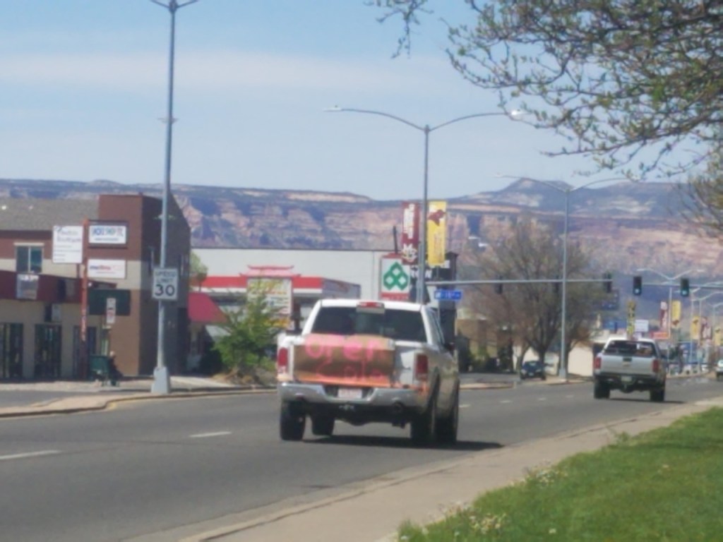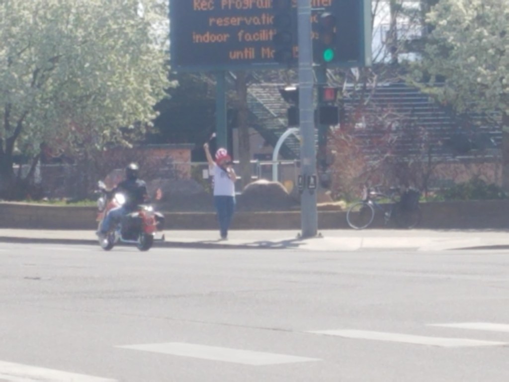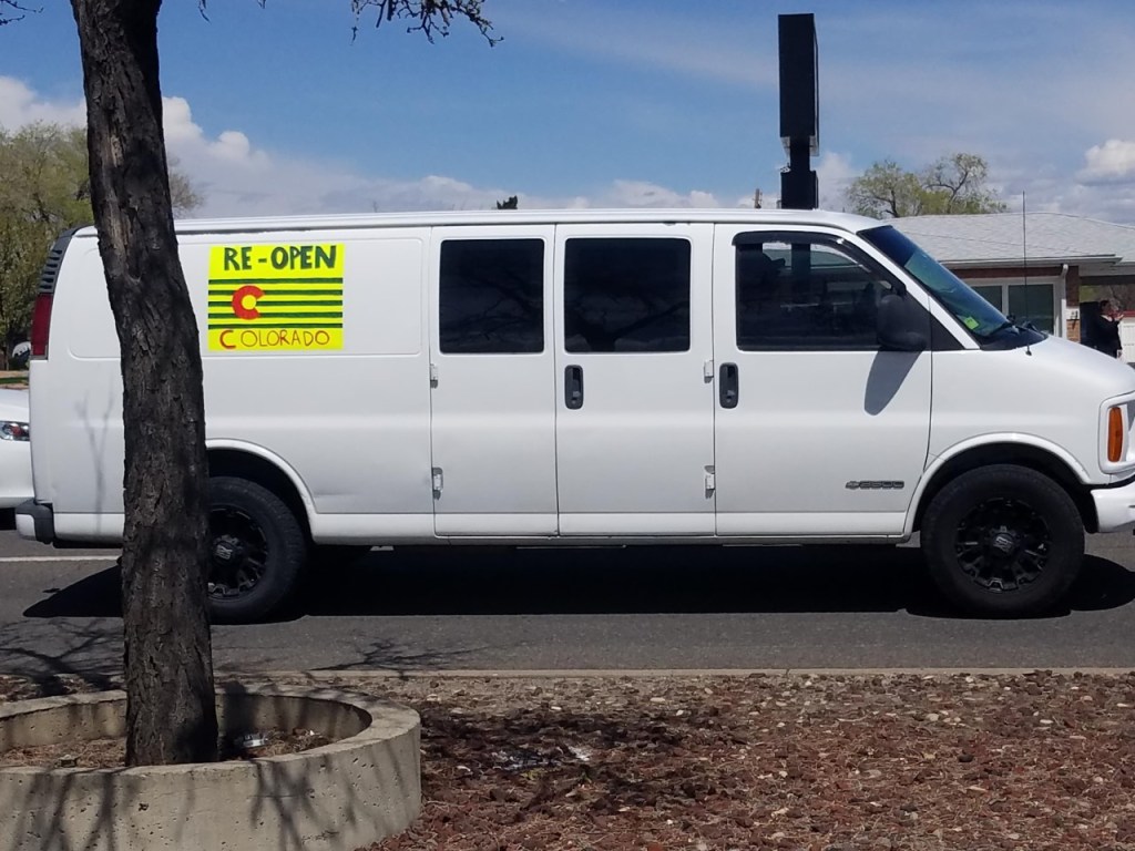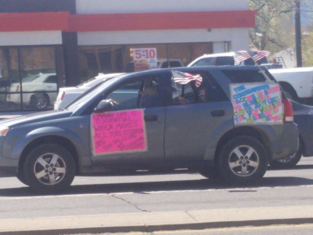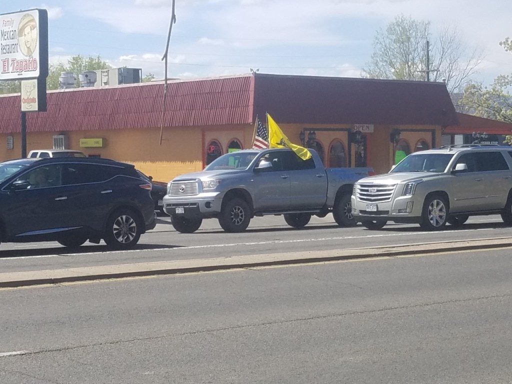 12:20: Traffic is stopped just past the 23rd Street intersection. The parking lot of the Teller Arms Shopping Center is overcrowded with demonstrators attempting to file onto North Ave. and begin the “Rally to ReOpen Colorado – Cruisin’ Style”. This is more what I thought would happen. As I’m stopped in traffic I turn and notice this supporter to my left.
