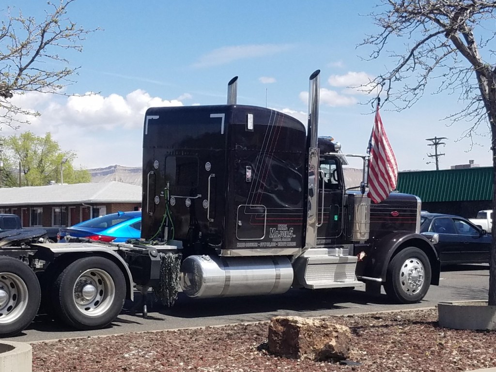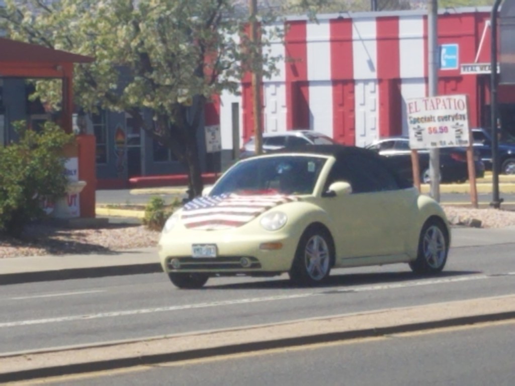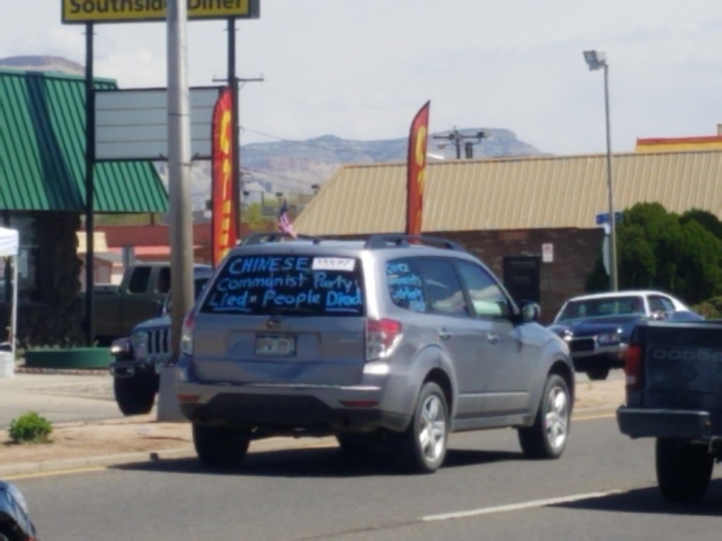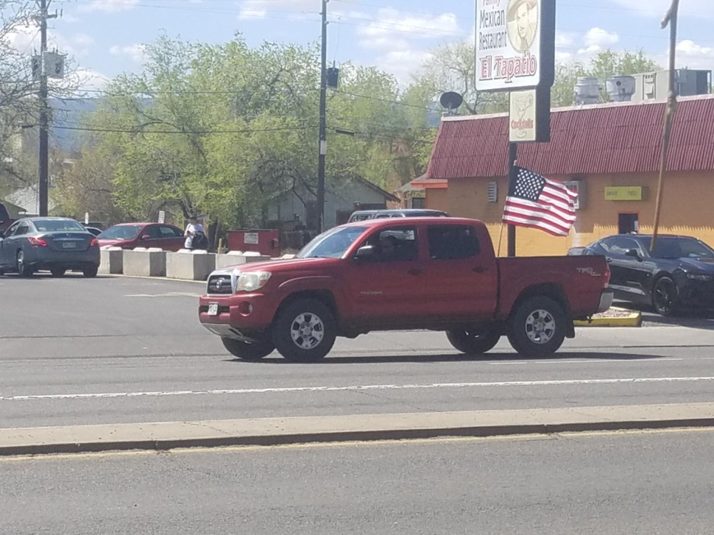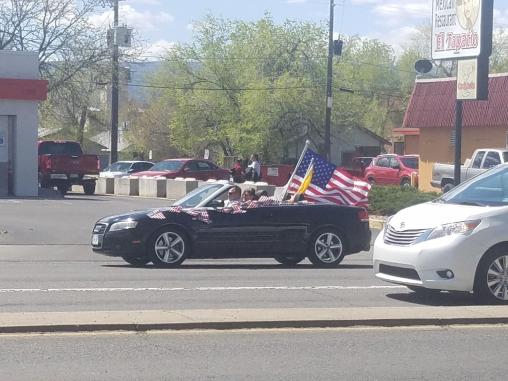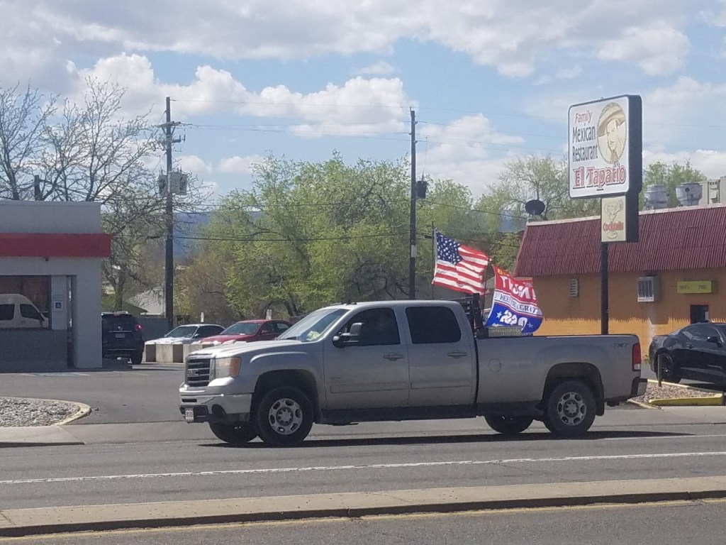 12:20: Traffic is stopped just past the 23rd Street intersection. The parking lot of the Teller Arms Shopping Center is overcrowded with demonstrators attempting to file onto North Ave. and begin the “Rally to ReOpen Colorado – Cruisin’ Style”. This is more what I thought would happen. As I’m stopped in traffic I turn and notice this supporter to my left.