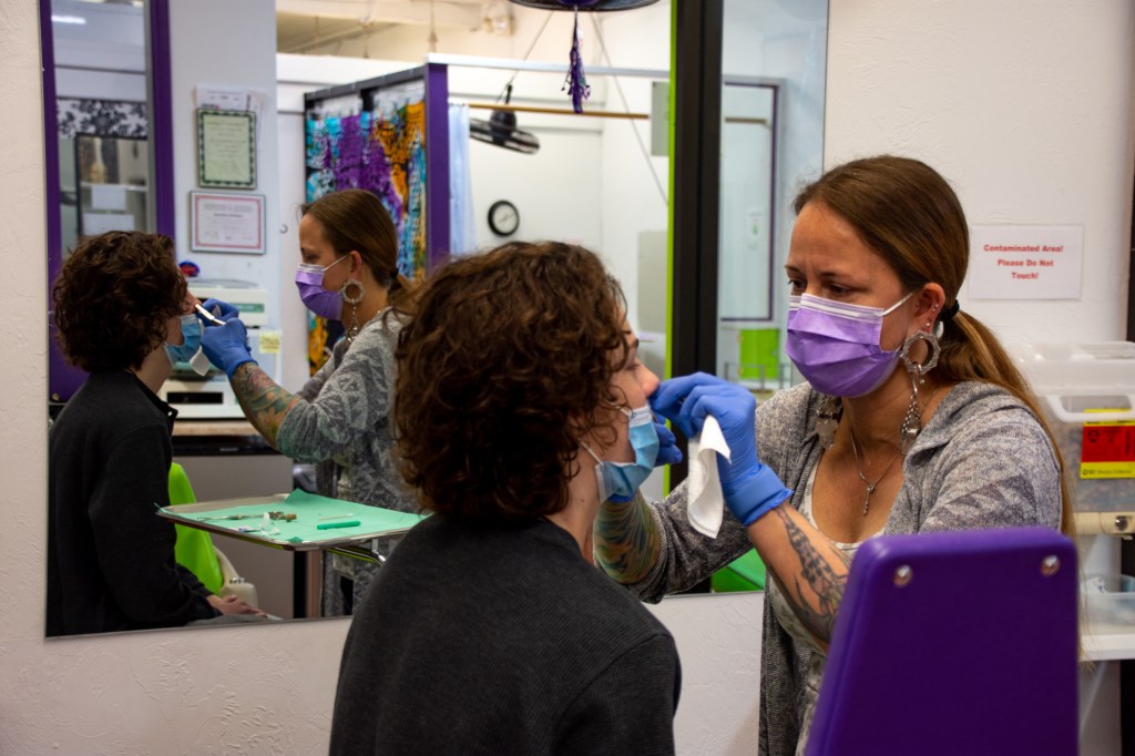 As customer D’Naya Stone and her roommates walk into the shop, they are immediately greeted by staff. The atmosphere is calm and comfortable, creating a sense of security. As the college sophomore approaches the display cases, store owner, Jennifer White, guides her choices. For today, Stone’s goal is to switch her jewelry. She was pierced by White a few months back when they put a small silver stud in her nose. Her goal is to now put a snug gold ring in. Taking into account her roommate’s comments, White begins to analyze Stone’s nose size.