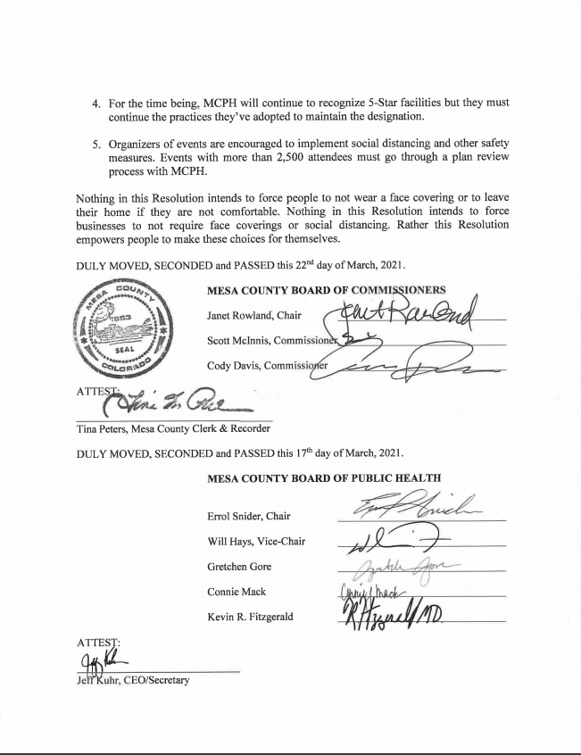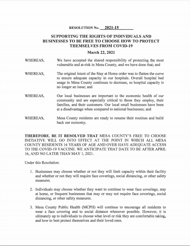 The timeline of the COVID-19 Corona Virus has been a long and challenging journey, and we have come a long way from 15 days to slow the spread. The end of COVID-19 is not yet upon us, but the end of government mandates regarding COVID-19 is. In the morning hours of Monday, March 22, the Mesa County Commissioners voted unanimously to pass Resolution No. 2021-15 SUPPORTING THE RIGHTS OF INDIVIDUALS AND BUSINESSES TO BE FREE TO CHOOSE HOW TO PROTECT THEMSELVES FROM COVID-19, which, as it states, will end the government-mandated COVID-19 restrictions in the county starting on April 16.