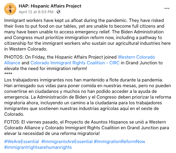 The Hispanic Affairs Project (HAP), Western Colorado Alliance (WCA) and Colorado Immgrant Rights Coalition (CIRC), were the organizations that joined together for this statewide banner dropping event, demanding congress and government officials a pathway to citizenship, freedom from deportation and COVID relief for all undocumented immigrants.