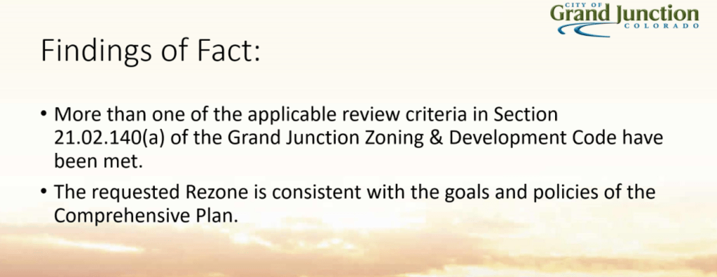 After the final vote, the motion to rezone the proposed land passed unanimously among the Grand Junction City Planning Commission.
