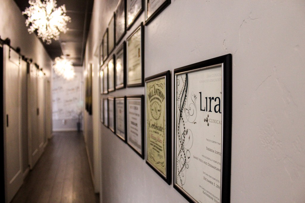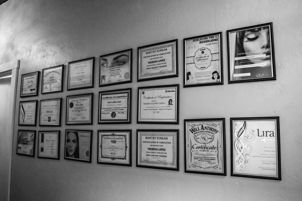 PHOTO BY: ARELY CHAVEZ. Hallway inside Flawless Glo displaying Theresa Lopez’s many certifications.