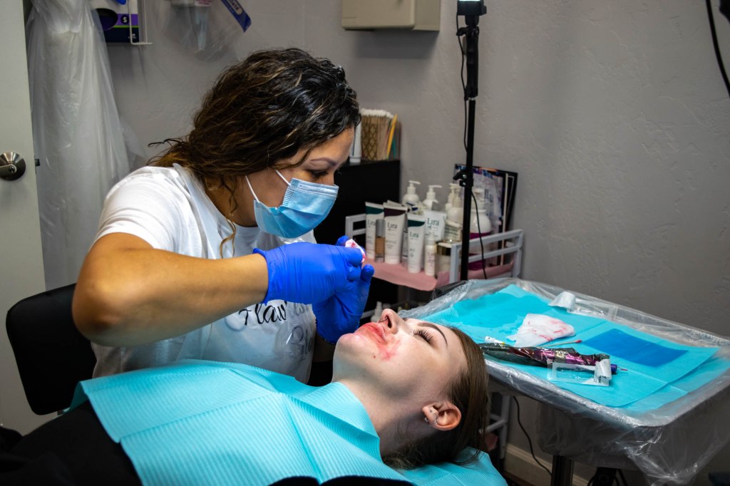 PHOTO BY: JILLIAN MACDONALD. Theresa Lopez cleans off ink residue during lip blush tattoo procedure on client, Payge McClenahan on April 13, 2021 at Flawless Glo.