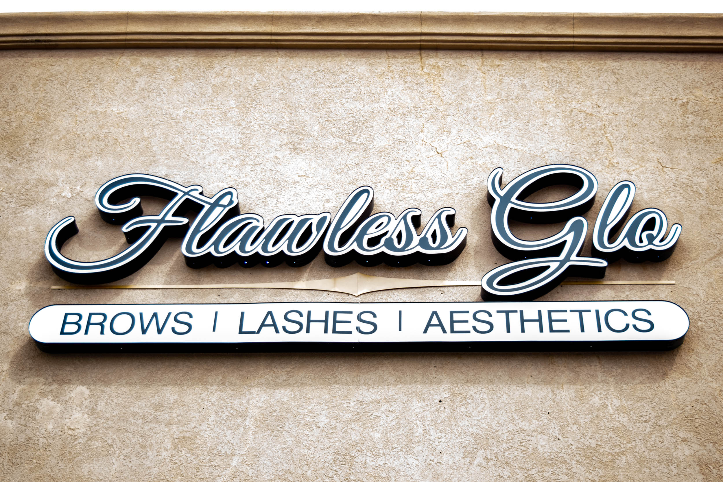 PHOTO BY: JILLIAN MACDONALD. Flawless Glo logo stands high above business on April 13, 2021.