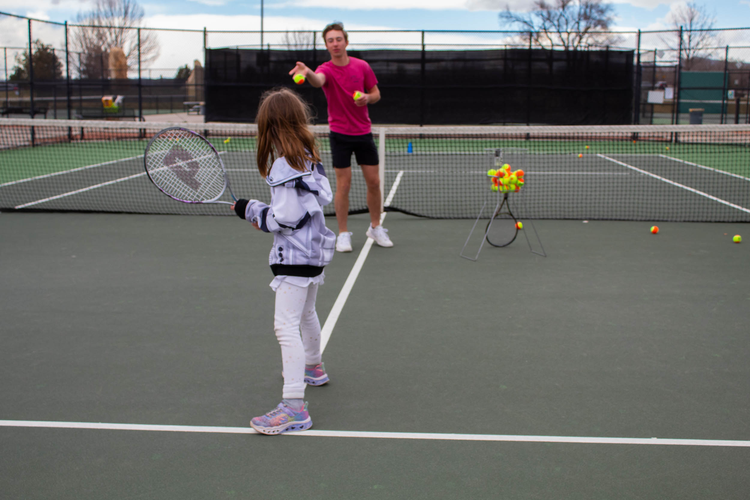 Makenna Livingston 4/5/23- John Miller, one of the staff working for the Mesa County Tennis Program, teaches a young student at Canyon View Park. Even on this chilly day of about 32 degrees, the courts are filled at Canyon View Park, with the tennis community flourishing here in Grand Junction, Colorado.
