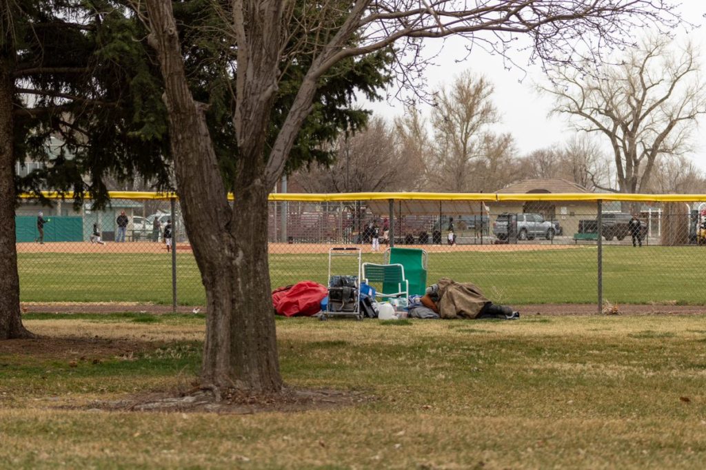 Houseless man sleeps at Columbine Park during a baseball practice. Summer Fredlund/April 5, 2023.