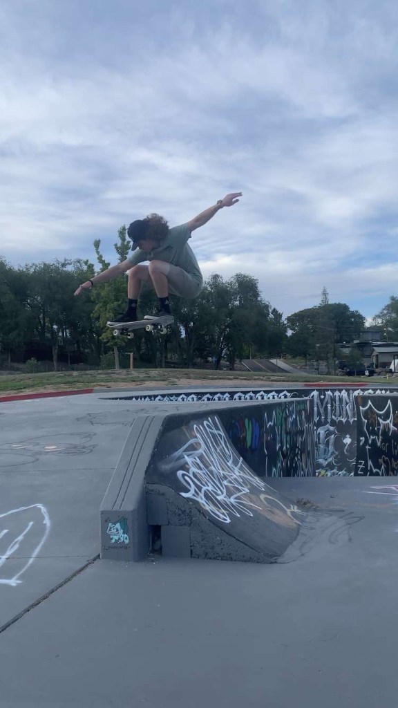 Greg Sheya performing tricks on one of the skateboards he purchased at Mutual Friends. (Collin McKenna, May 2023).