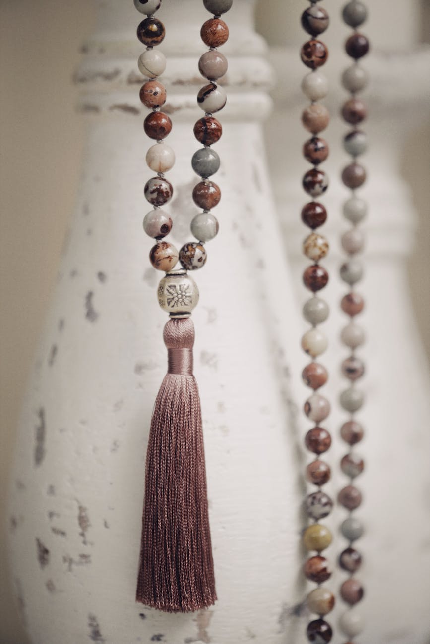 In order to mediate with a mala, you hold the beaded string in your hand. Place one finger on the bead near the tassel at the top of the strand. Complete one cycle of breaths or repeating mantras for every bead that you trace with your finger.