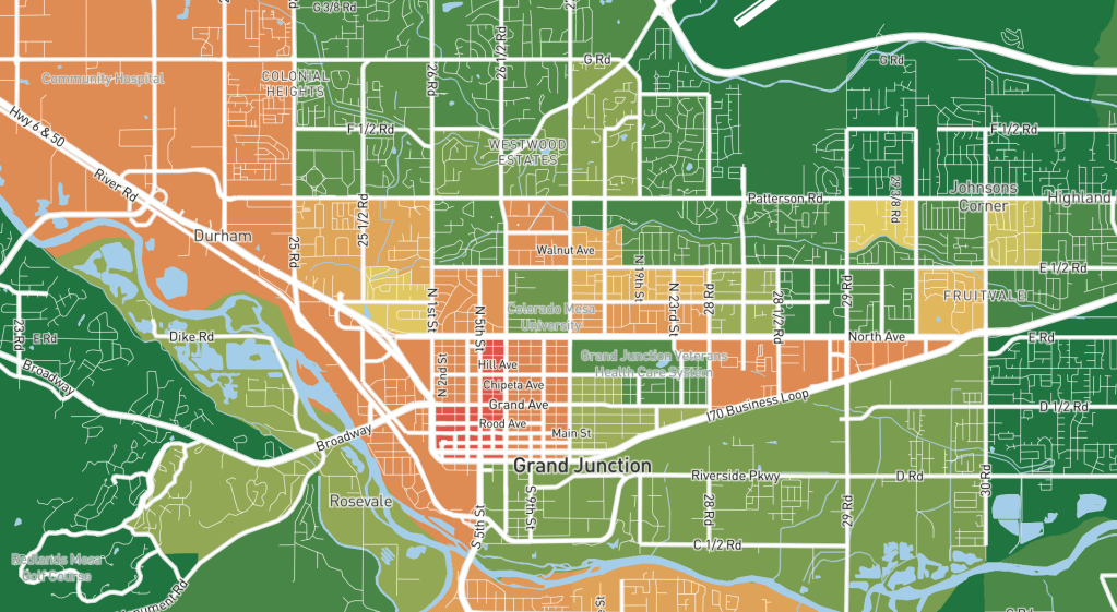 The map above shows the regions of property theft in Grand Junction, and the surrounding area. The green regions shows the green to be above the national average in property theft, orange shows average, and the red shoes below average, according to Crime Grade.