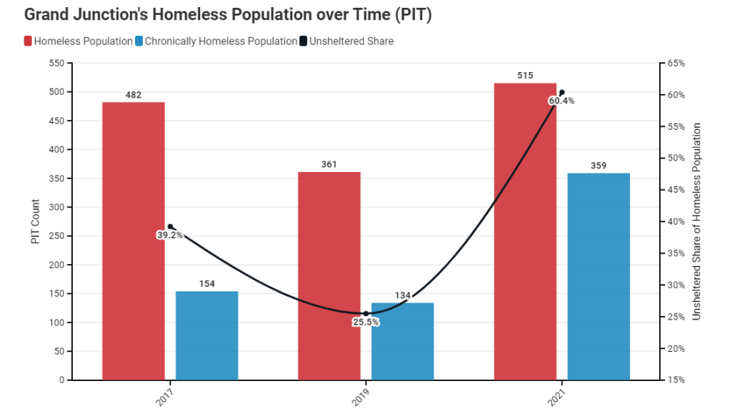 According to the Common Sense Institute, 60.4% of the homeless population in Grand Junction remained unsheltered in 2021.