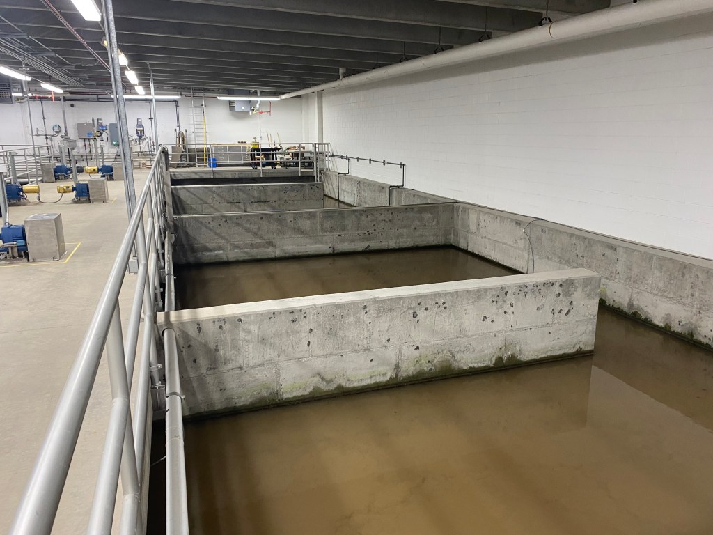 The process begins with what’s called an aluminum sulfate flash mix chamber. Aluminum sulfate is a coagulant, meaning it’s positive charge attracts the negatively charged dirt particles in the water, bonding the dirt into cloud-like groups that the engineers call the flock.