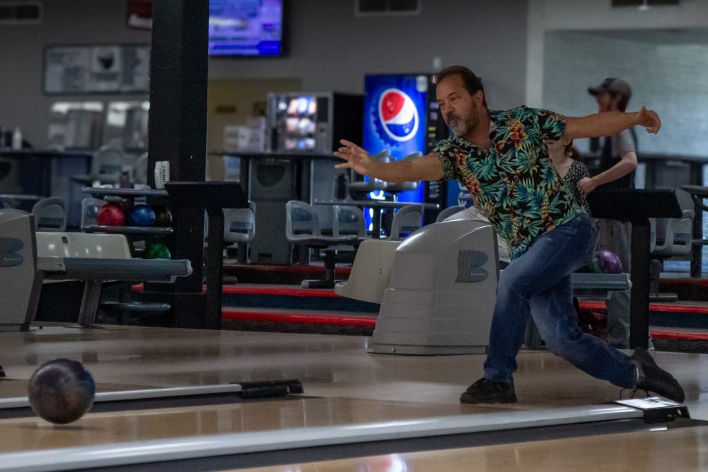 Leaning into the lane with practiced ease Donnie Gilbert, chases strikes in the quiet comfort of an afternoon game. (Adelaide Martinsen, April 2025)