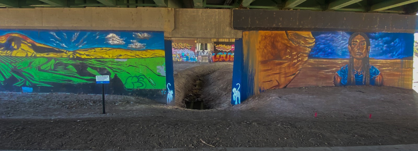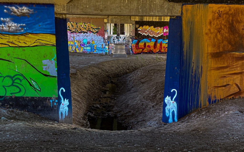 One of the best areas for large-scale graffiti art happens under the underpasses going over the river. Fifth Street Bridge was the only bridge going over the river for a long time and it saw a lot of art action because of the sessional sand bar under it; the sand bar allows access to the middle pillars. The river trail is the best way to access this location and if you play disk golf the course has a basket under one of these passes. The concrete pilers are long and wide supporting the highway as it spans the river. Here on both sides, there are graffiti murals everywhere. The larger works of art change from time to time and the city does not cover them for whatever reason.